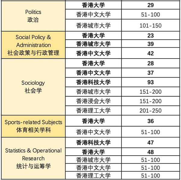 包含商科、傳媒等熱門專業(yè)的社科領(lǐng)域,香港有5所院校打入世界前100。